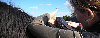 - Is het zadel in orde, dan wordt het op de paardenrug gelegd en controleert de Msfc® of het zadel in rust en niet aangesingeld de paardenrug overal gelijk volgt en in balans ligt.